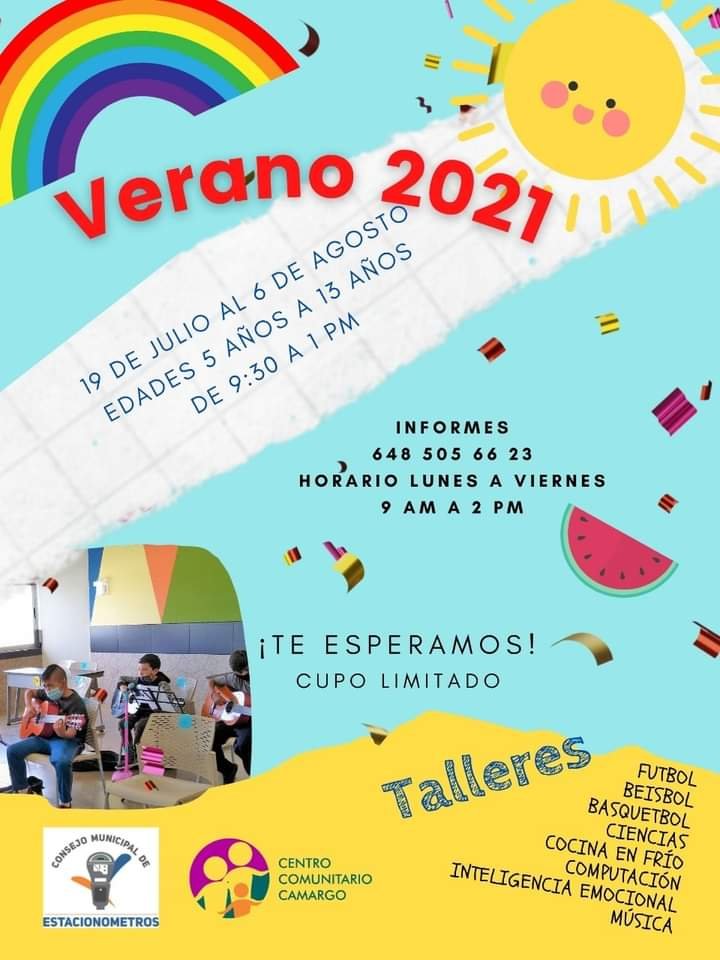 El centro comunitario Camargo en coordinación con estacionómetros hace la invitación a los niños de 5 a 13 años de edad a acudir a la veraneada “totalmente gratis” que se estará llevando a cabo del 19 de julio al 6 de agosto en un horario de 9:30 a.m. a 1 p.m.