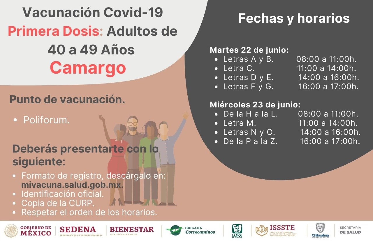 El día de mañana se vacunará a los adultos de 40 a 49 años de edad y embarazadas mayores de 18 años, en el municipio de Camargo y el punto de vacunación será en el Poliforum.