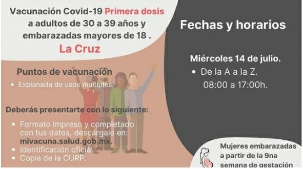 Este miércoles 14 de julio inicia la vacunación a personas de 30 a 39 años en el municipio de La Cruz, únicamente se llevará a cabo ese día en un horario de 8 de la mañana a 5 de la tarde.