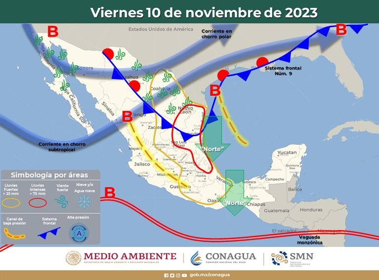Para este viernes 10 de noviembre, se pronostican vientos con velocidades que llegarán a los 46 kilómetros por hora (km/h) en la zona norte de la entidad, con un ambiente cálido por la tarde y temperaturas bajas con heladas en la zona serrana como consecuencia del frente frío número 9.
