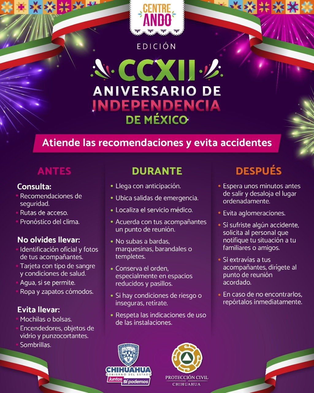 La Coordinación Estatal de Protección Civil (CEPC) invita a la población a seguir las recomendaciones de prevención y seguridad emitidas por las autoridades correspondientes para garantizar un saldo blanco, antes, durante y después de los eventos por los festejos de la Independencia de México.