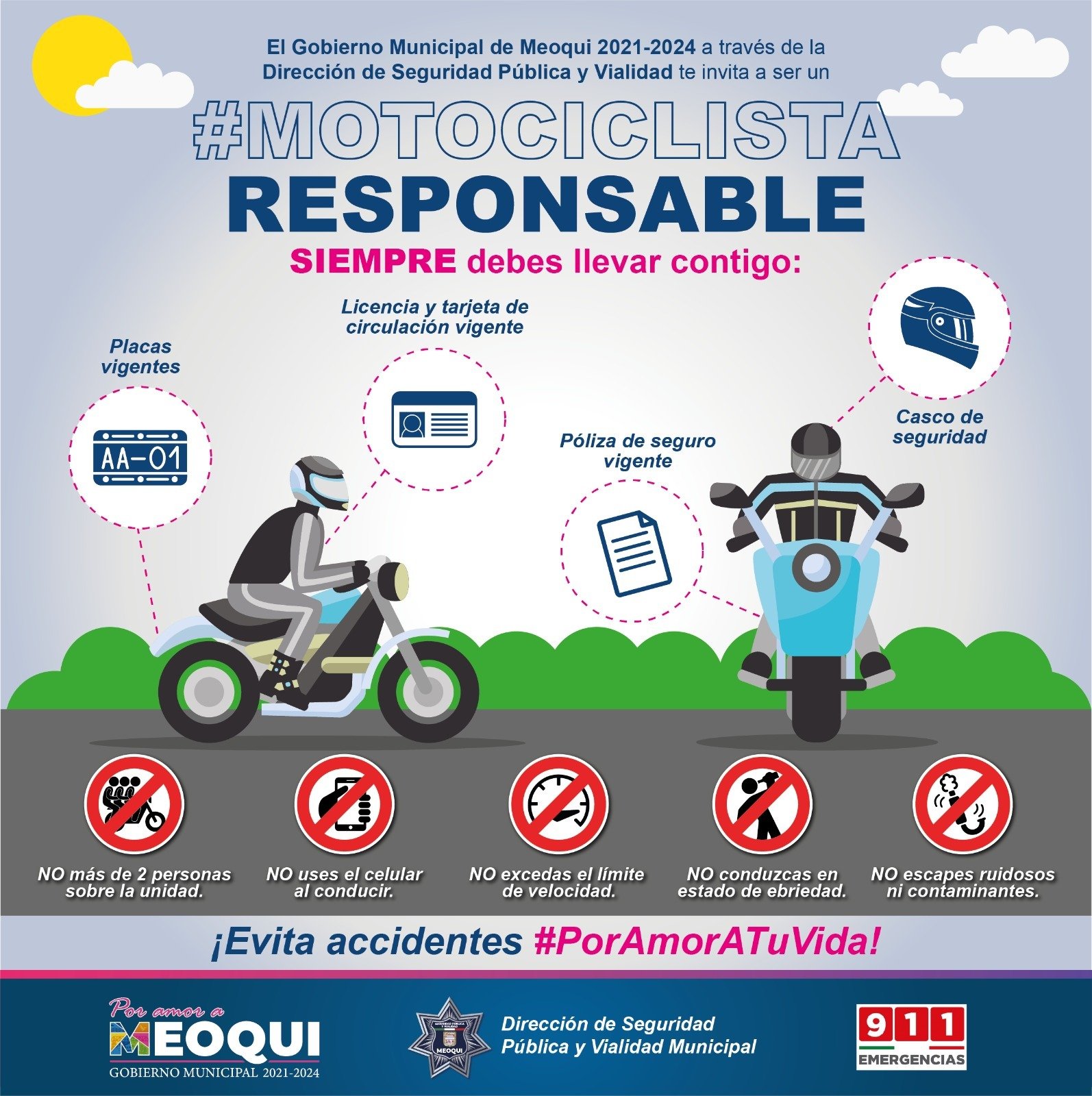 Luego del arranque de la Campaña “Motociclista Responsable”, que dio la alcaldesa Miriam Soto en el municipio de Meoqui, la dirección de Seguridad Pública Municipal emitió las recomendaciones para conducir correctamente uno de estos vehículos, entre las que destacan: No más de dos personas sobre la unidad, no escapes ruidosos ni contaminantes, no exceder el límite de velocidad, entre otras.