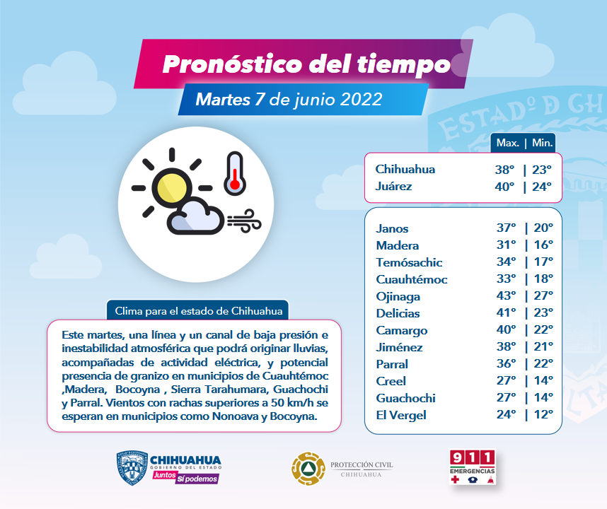 La dependencia indicó que hoy, la temperatura máxima será de hasta 38 grados centígrados (°C) en Ojinaga y Chínipas, 36°C en Juárez y Delicias, y 35°C en Chihuahua y Camargo. La zona serrana mantendrá un ambiente frío, con máximas de 26°C y cielos despejados.