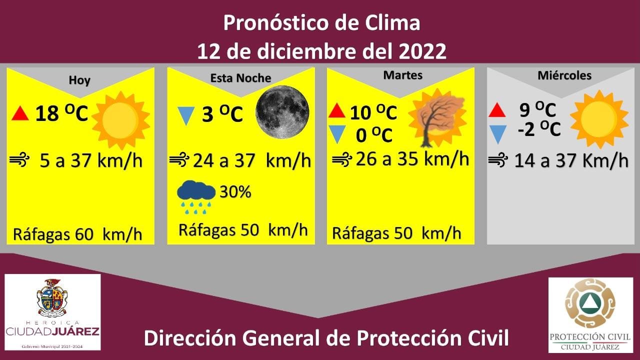 Para hoy se espera una temperatura máxima de 18 °C y mínima de 3 °C, la velocidad del viento se pronostica de 5 a 37 kilómetros por hora.