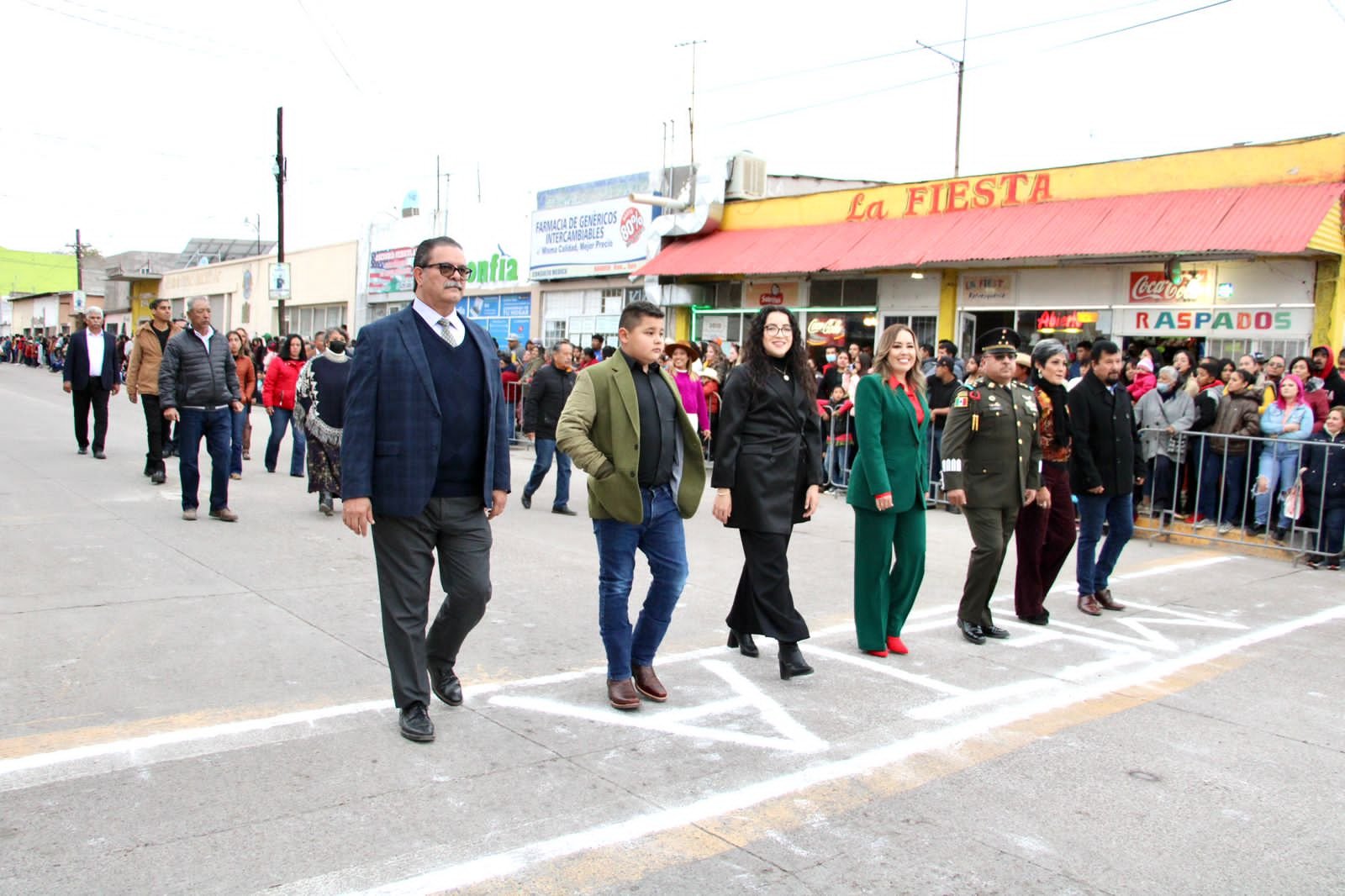 Acompañada por la Lic. Donata Estefania García López, presidenta del DIF municipal, del síndico C. Rodolfo Gardea Palma, del secretario del Ayuntamiento el Ing. Luis Arturo Chavarría Camargo, la alcaldesa formó parte del primer contingente del desfile cívico-deportivo con el cual se celebra el 112 aniversario de la Revolución Mexicana.