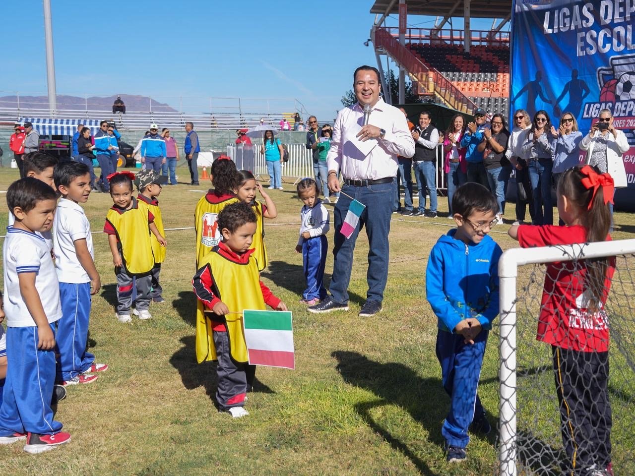 Con el firme propósito de seguir impulsando la formación integral desde la primera infancia, el presidente municipal de Delicias, Jesús Valenciano García, encabezó la ceremonia de apertura de las Ligas Deportivas Escolares 2025, iniciando con el tradicional “Mundialito de Fútbol”, que reunió a más de 600 alumnos de 22 preescolares en un ambiente de convivencia y entusiasmo.