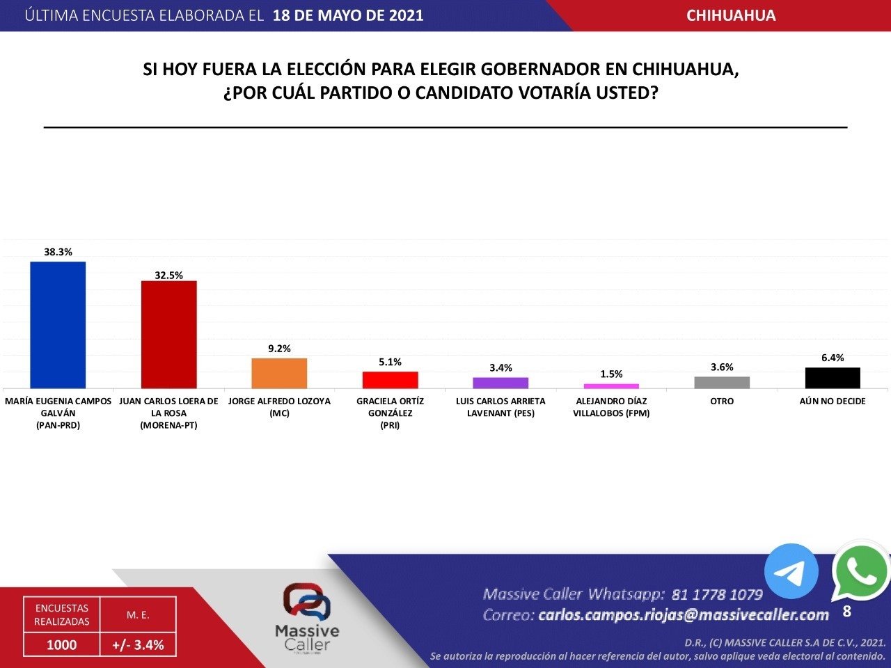 La empresa encuestadora Massive Caller reveló su encuesta quincenal rumbo a la gubernatura 2021 donde fueron encuestados mil personas a las cuales se le cuestionó a cada uno con la siguiente pregunta; “Si el día de hoy fuera la elección para elegir gobernador de chihuahua, ¿Por cuál partido o candidato votaría usted?”.