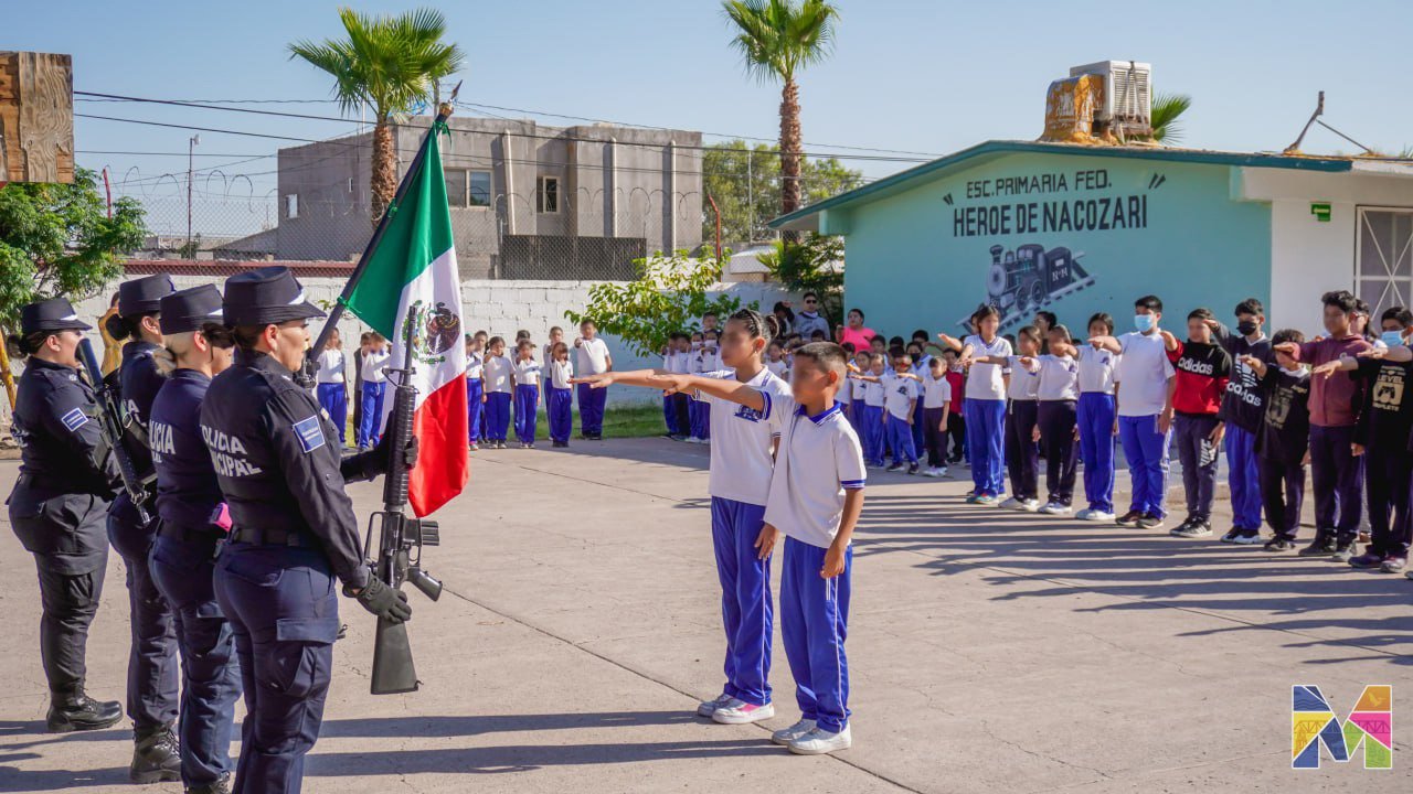 “Niños y niñas siéntense muy orgullosos de pertenecer a su escuela Héroe De Nacozari”, expresó la alcaldesa Miriam Soto durante su mensaje al encabezar los Honores a la Bandera en la institución del municipio de Meoqui, donde los elementos de Seguridad Pública Municipal acudieron para convivir con los alumnos y fortalecer el vínculo con los pequeños con el Programa “Policía Amigo”.