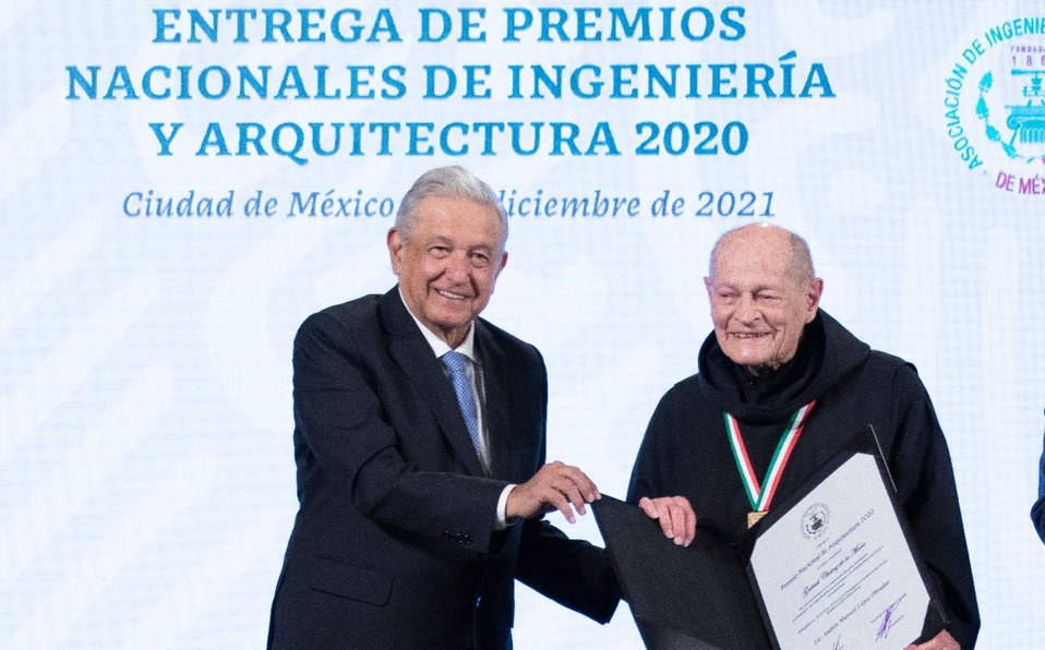 Los premios 2020 de la Asociación de Ingenieros y Arquitectos de México fueron entregados en Palacio Nacional. Los ganadores fueron el arquitecto Fray Gabriel Chávez de la Mora y el ingeniero Francisco Garaicochea Petrirena.