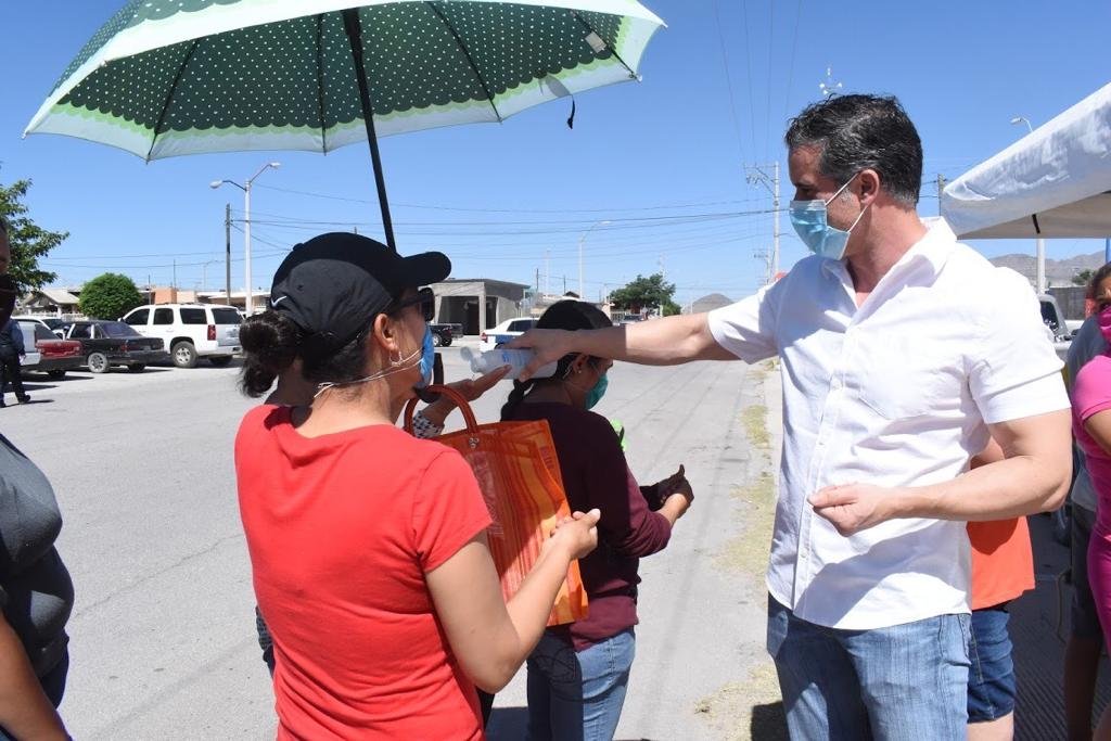 Acompañado del presidente municipal de Camargo, Arturo Zubia Fernández, el funcionario estatal distribuyó los kits de higiene que contienen gel antibacterial y jabones, así como las medidas preventivas que la comunidad debe tomar para evitar los contagios.