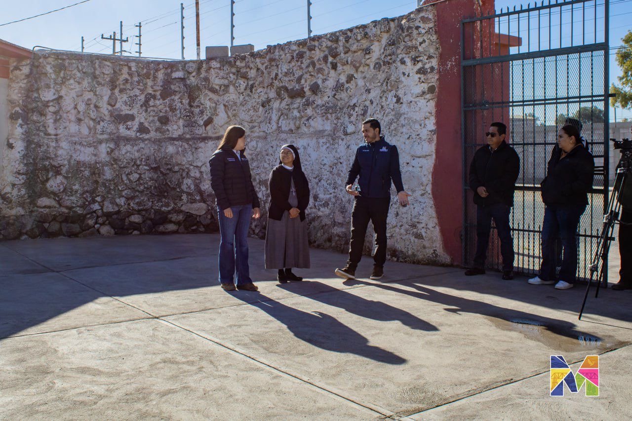 Entrega Miriam Soto rehabilitación de acceso principal de Asilo El Peregrino en Meoqui