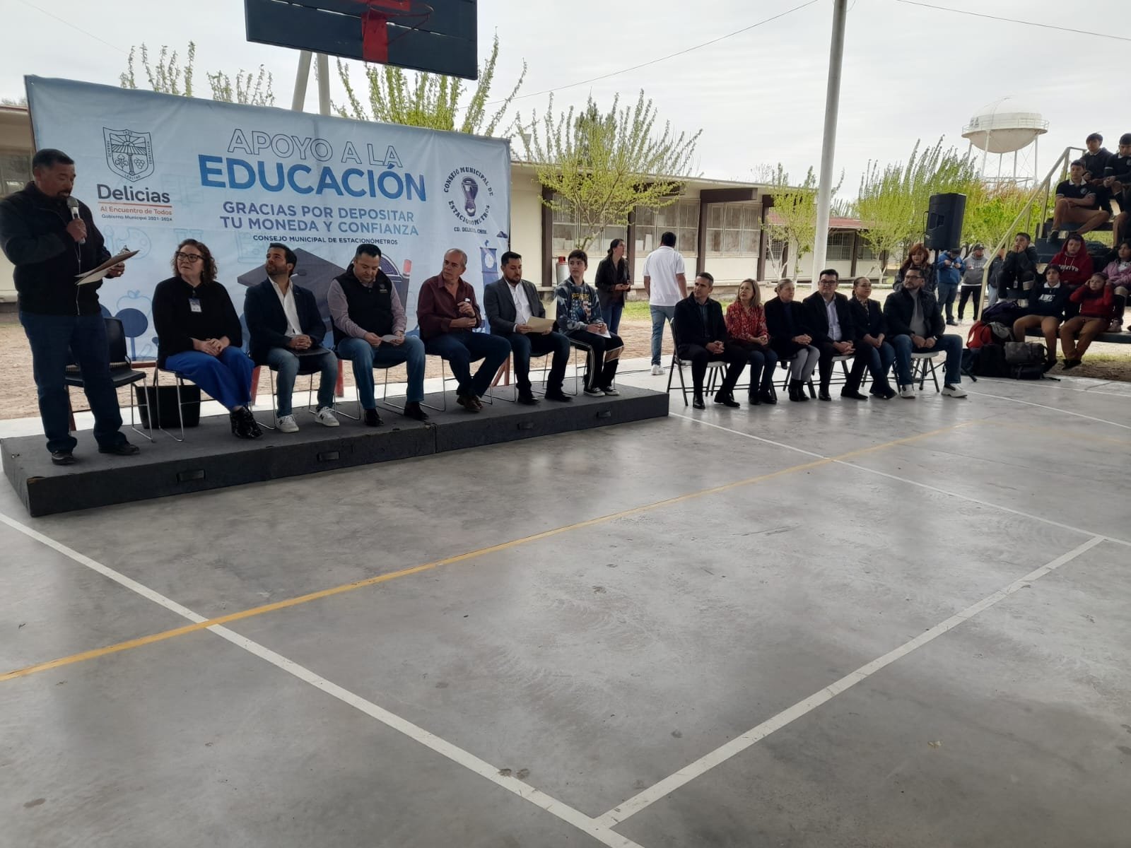 El alcalde de Delicias, Jesús Valenciano, con el apoyo de Index Chihuahua y el Club Activo 20-30, realizó la entrega oficial del encementado de la cancha deportiva de la secundaria 43.