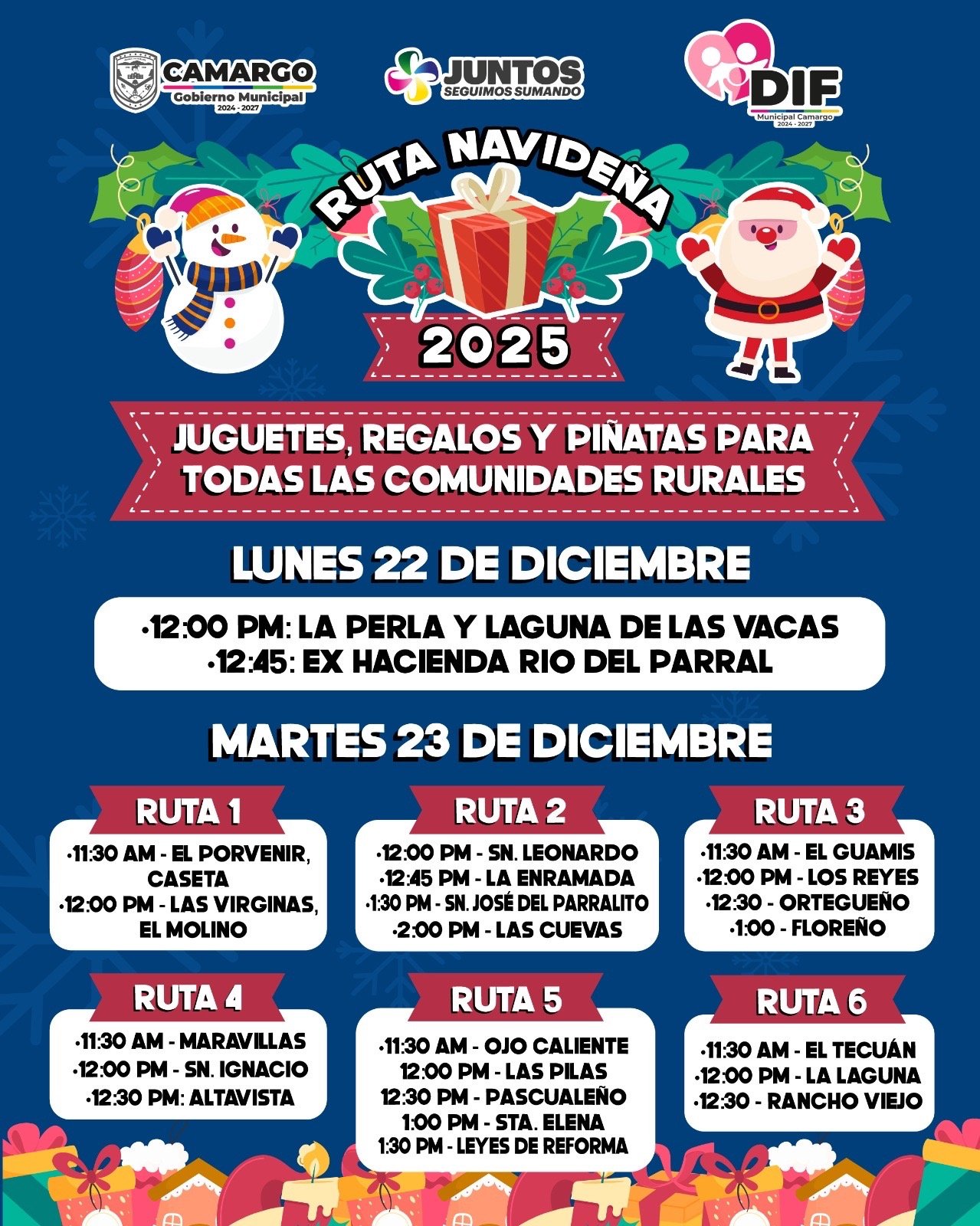 El Gobierno Municipal de Camargo, en coordinación con el DIF Municipal, llevará a cabo la Ruta Navideña 2025, una jornada de entrega de juguetes, regalos y piñatas dirigida a niñas y niños de todas las localidades rurales del municipio.