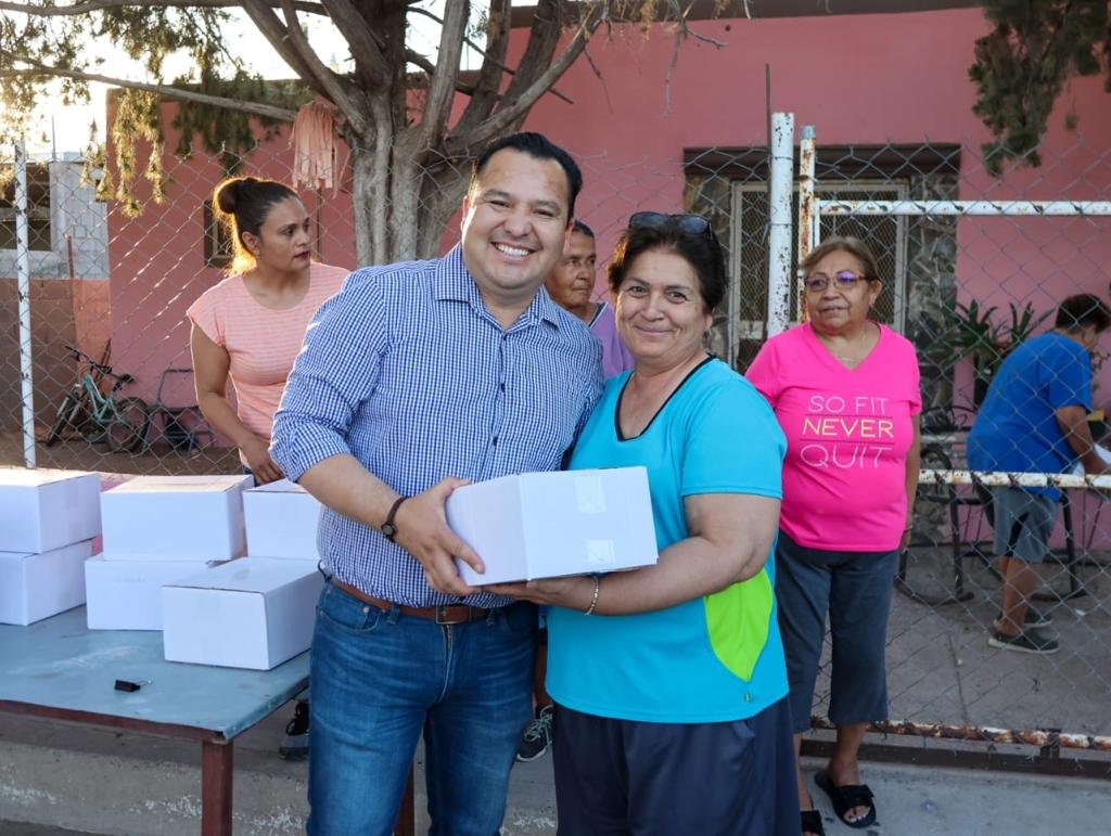 El Presidente Municipal de Delicias, Jesús Valenciano, entregó apoyos alimentarios para más de 50 familias de la colonia La Merced, una de las más alejadas de la mancha urbana de la ciudad, situada en los límites con el vecino municipio de Saucillo.