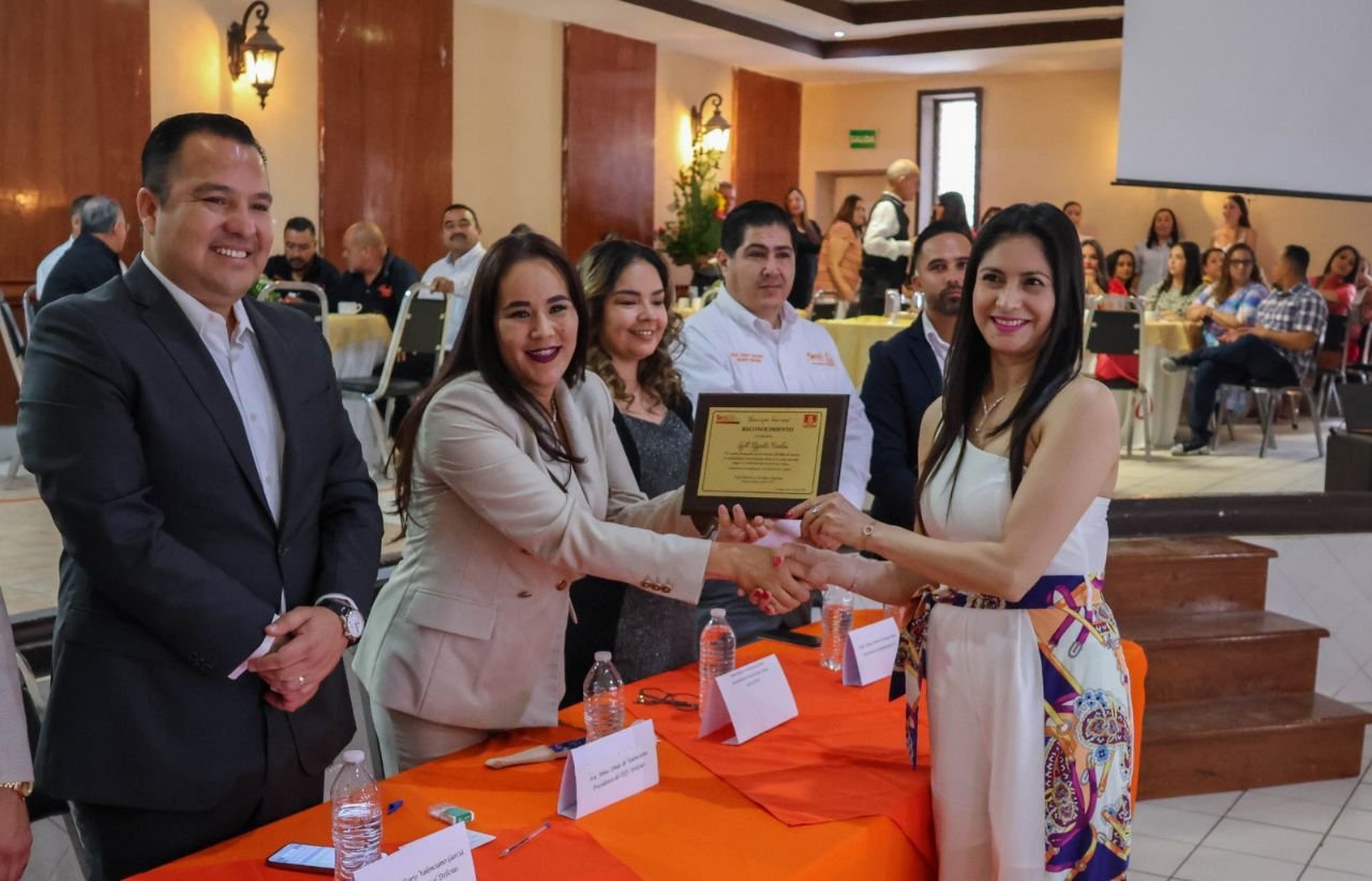 Con motivo al día de la Educadora, el Presidente Municipal, Jesús Valenciano, acudió al desayuno que llevó a cabo el SNTE sección 8, en las instalaciones del club Rotario Delicias, lugar donde hizo entrega de la Moneda Conmemorativa del 90 Aniversario de Delicias a la maestra Leticia Domínguez por sus 40 años de servicio.