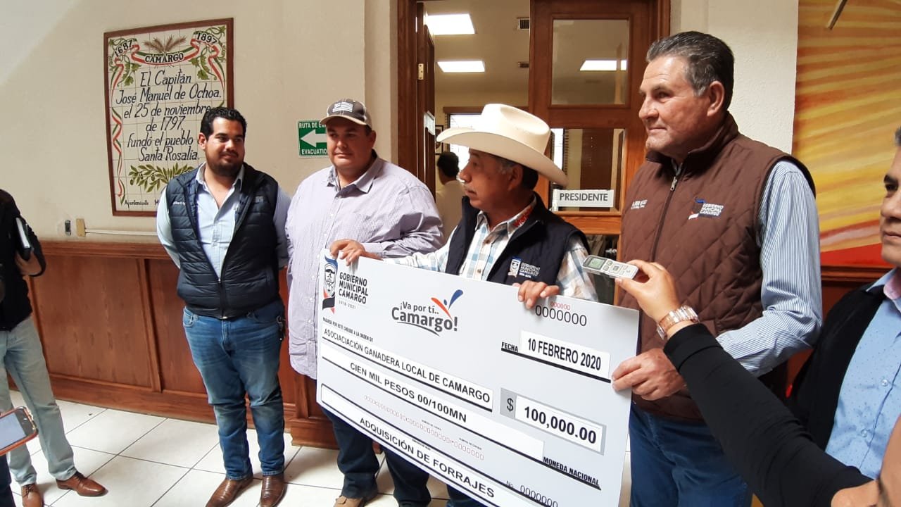 Camargo.- Con la finalidad de continuar con la entrega de apoyos al sector productivo local, la mañana de este lunes el Presidente Municipal, Arturo Zubía Fernández, hizo entrega del apoyo económico a la Asociación Ganadera Local de Camargo, por 100 mil pesos.