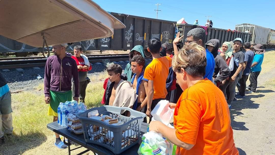 Entregan voluntarios del grupo Halcones de la Perla del Conchos víveres a migrantes en el ferrocarril