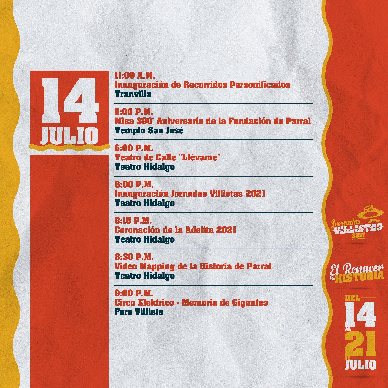 Por lo anterior las Jornadas Villistas 2021 se estarán realizando bajo la supervisión del programa Médico en tu Casa, con las medidas de sana distancia, uso de cubre bocas, lavado de manos y sanitización de espacios, antes, durante y después de cada evento.