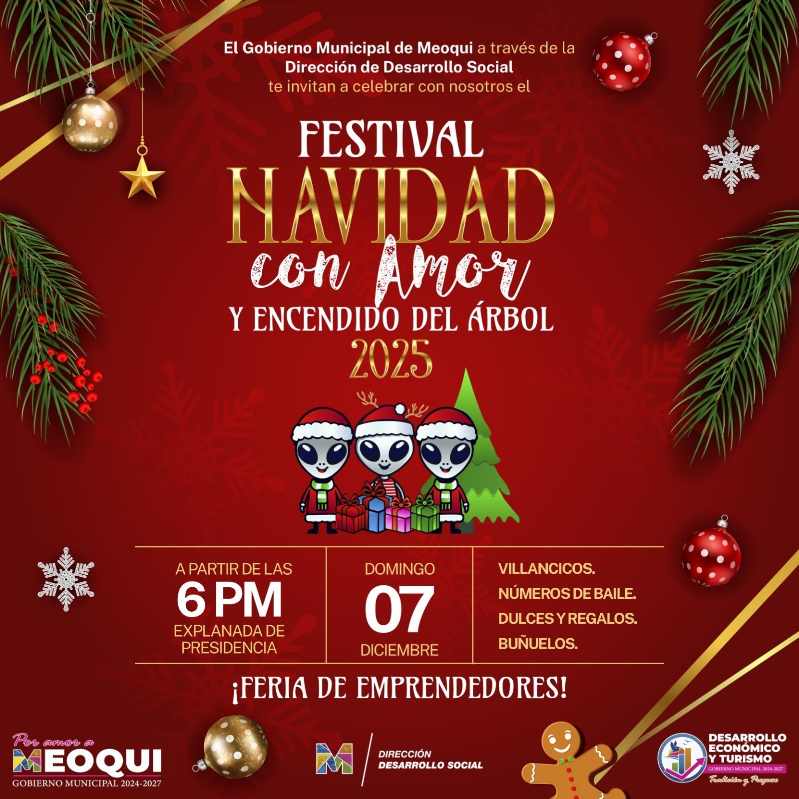 Este domingo 7 de diciembre, a partir de las 6 de la tarde en la Explanada de la Presidencia Municipal de Meoqui se llevará a cabo el Festival “Navidad con Amor”, con el tradicional encendido del árbol, donde habrá villancicos, números de baile, dulces, regalos, Feria de Emprendedores y muchas sorpresas para las familias.