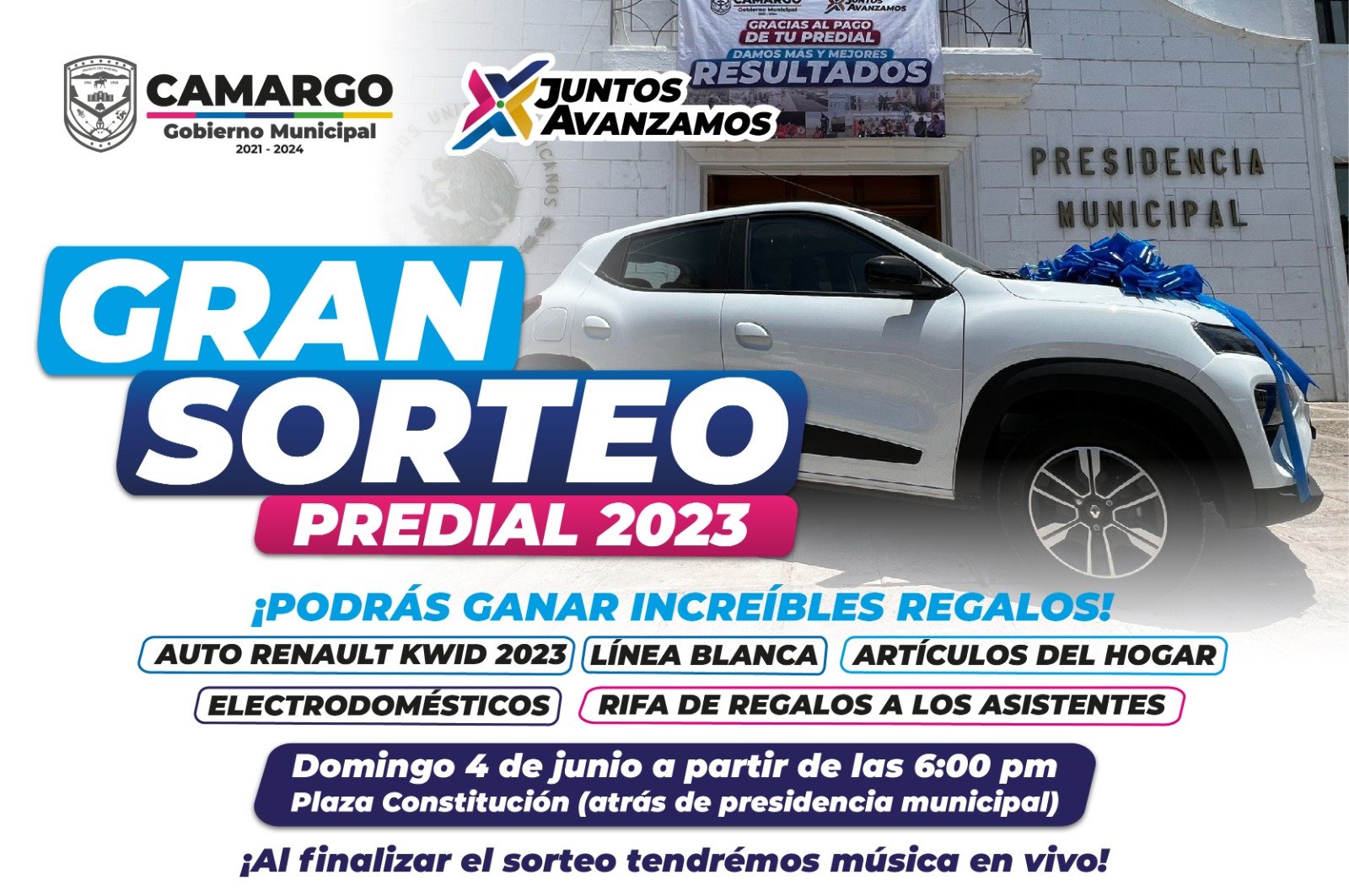El Gobierno Municipal, a través de Tesorería y la oficina de Catastro, invitan a ser parte del gran sorteo del predial 2023, en donde participarán más de 15 mil contribuyentes cumplidos en el pago de su predial. El evento iniciará a las 6 de la tarde, en donde se dará el sorteo de los regalos más pequeños, para luego conocer el o la ganadora del automóvil 2023. Para finalizar este evento se tendrá música en vivo.