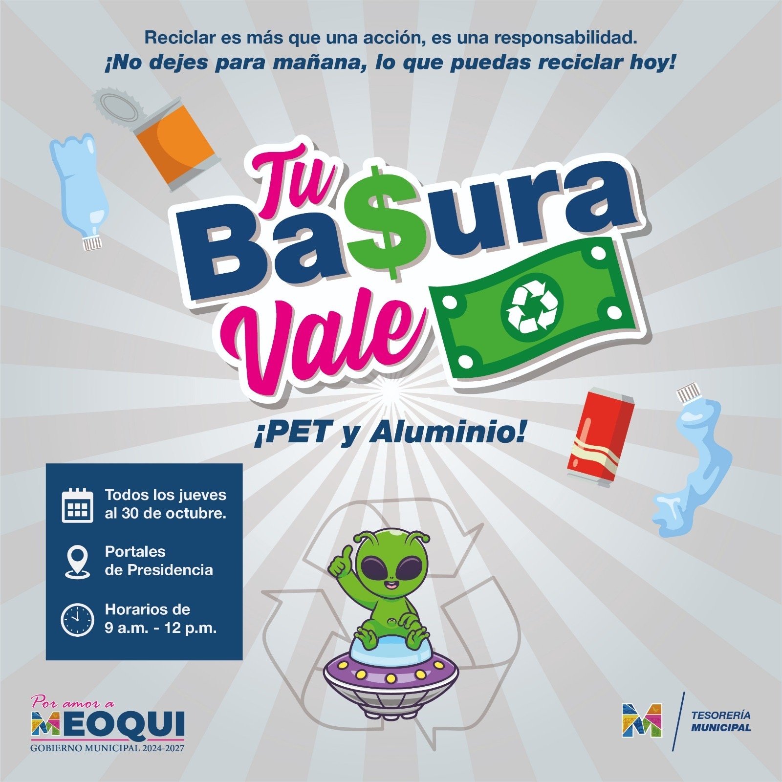 Como cada jueves en Meoqui y hasta el 30 de octubre, se realizará el programa “Tu Basura Vale”, el cual consiste en el canje de materiales reciclables como PET en botellas de plástico y aluminio en latas y botes, esto con el objetivo de fomentar el hábito del reciclaje, así como apoyar a los contribuyentes para que se pongan al corriente con su impuesto predial.