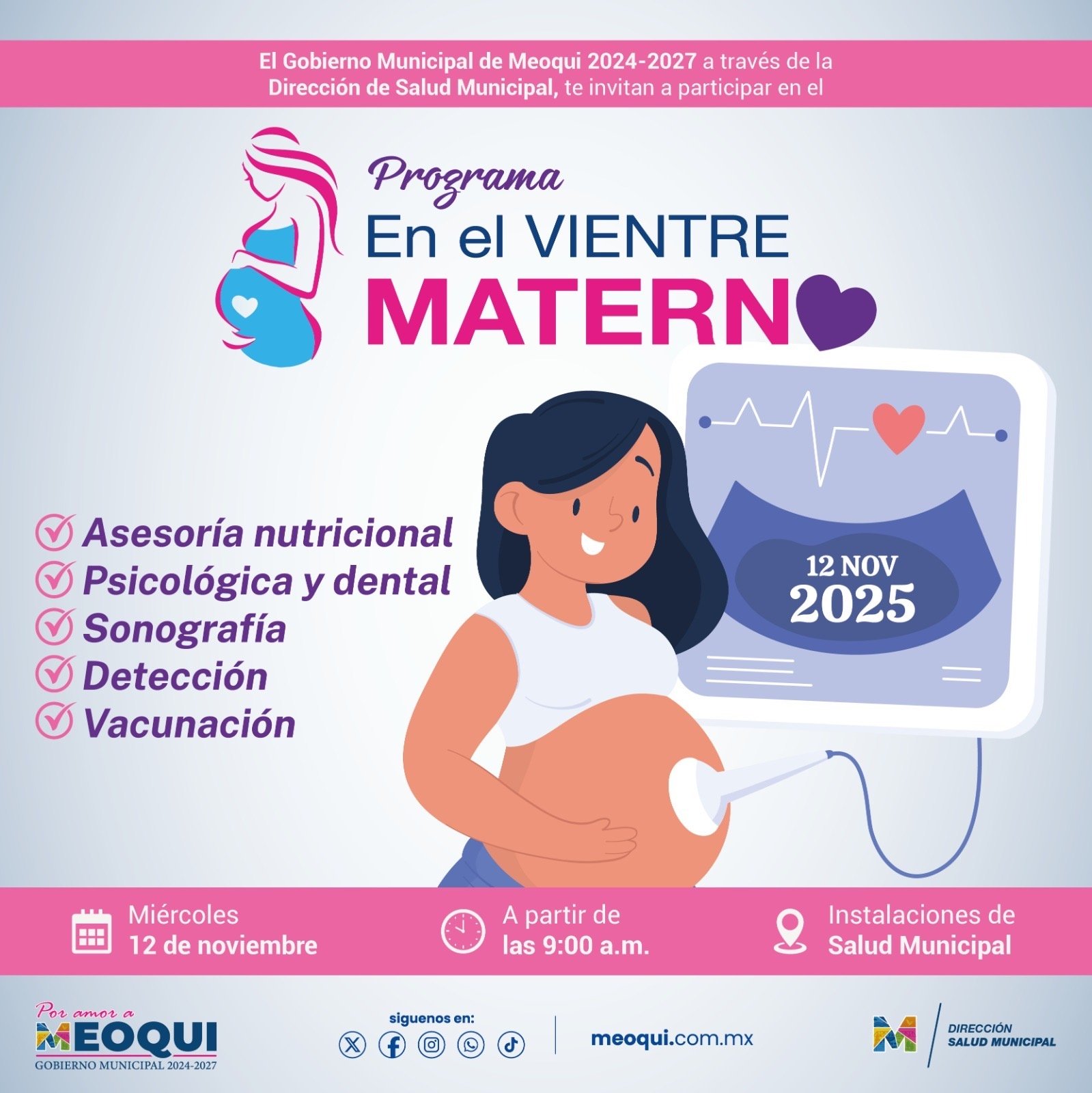 Este próximo miércoles 12 de noviembre, se llevará a cabo una nueva jornada del programa “En el Vientre Materno”, en el que mujeres embarazadas tendrán acceso a servicios como consulta médica general, vacunación, asesoría nutricional, psicológica y dental, además de la realización de ultrasonidos obstétricos por un médico gineco-obstetra, el cual se realizará en las nuevas instalaciones de la Dirección de Salud Municipal a un costado de la Primaria Sector Obrero a partir de las 9 de la mañana.