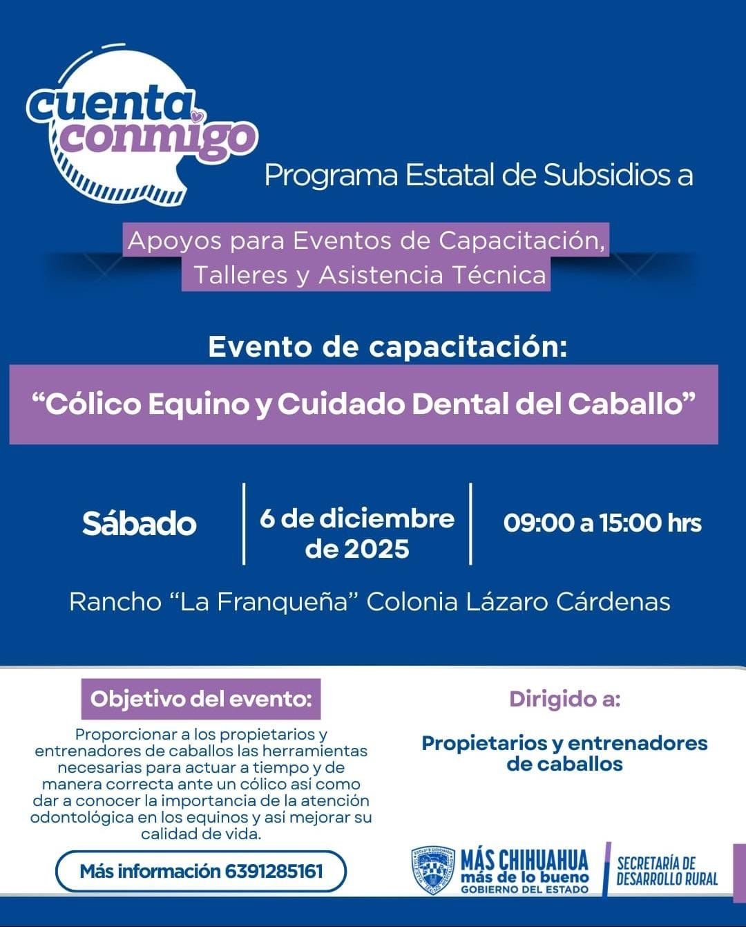 Este próximo sábado 6 de diciembre se llevará a cabo una capacitación sobre cólico equino y cuidado dental del caballo totalmente gratuito a las 9:00 de la mañana en el rancho La Franqueña, ubicado en la colonia Lázaro Cárdenas, esto gracias a las gestiones de la alcaldesa Miriam Soto ante la Gobernadora Maru Campos.