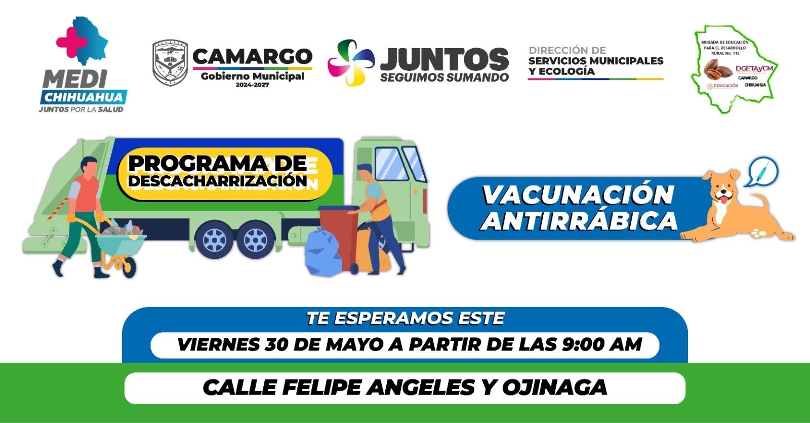 El Gobierno Municipal de Camargo invita a la ciudadanía a participar en la jornada de descacharrización y vacunación antirrábica, que se llevará a cabo este viernes 30 de mayo a partir de las 9:00 a.m. en el cruce de las calles Felipe Ángeles y Ojinaga.