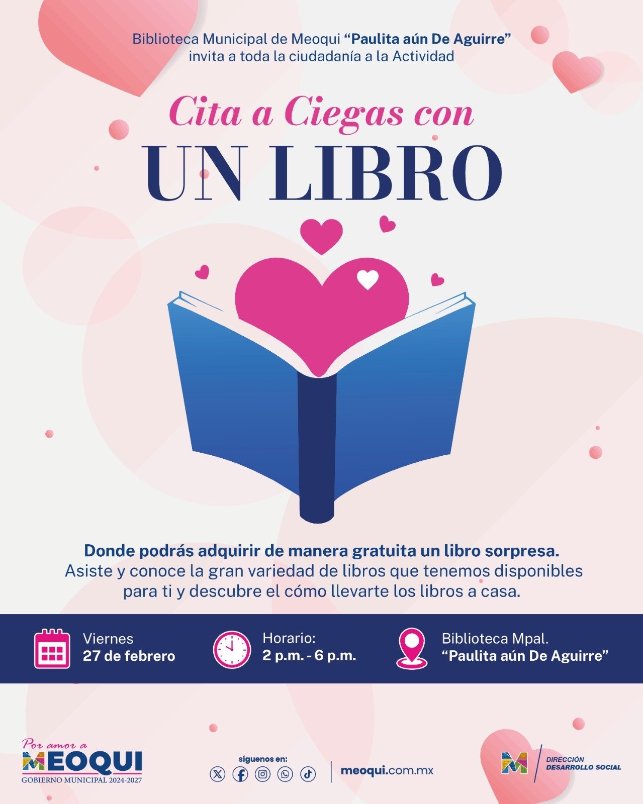 En el marco del Mes del Amor y la Amistad, el Gobierno Municipal de Meoqui, a través de la Dirección de Desarrollo Social, invita a la ciudadanía a participar en la actividad “Cita a Ciegas con un Libro”, en donde podrán obtener un libro de manera gratuita, que se llevará a cabo en la Biblioteca Municipal “Paulita Aún de Aguirre”, este viernes 27 de febrero, en un horario de 2:00 p.m. a 6:00 p.m.