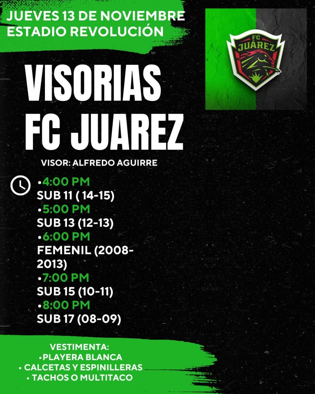 Las pruebas estarán a cargo del visor Alfredo Aguirre, quien evaluará a jugadores y jugadoras en distintas categorías a partir de las 4:00 de la tarde. Los horarios se distribuirán de la siguiente manera: