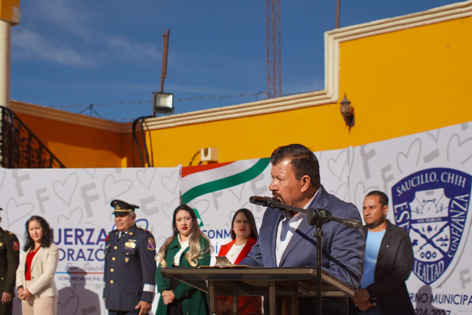 El alcalde de Saucillo, Fito Gardea, encabezó la ceremonia conmemorativa del Día de la Bandera, destacando la importancia de fortalecer los valores cívicos y el orgullo por México y por el municipio.