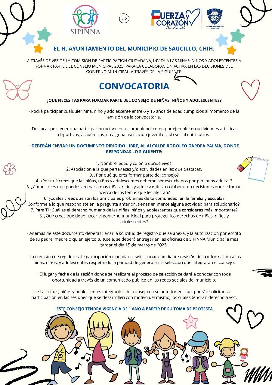 Con el compromiso de fomentar la participación infantil y juvenil en la toma de decisiones que les afectan, el presidente municipal de Saucillo, Fito Gardea, a través del Sistema de Protección Integral para Niñas, Niños y Adolescentes (Sipinna) Saucillo, ha lanzado la convocatoria para integrar el Consejo de Niñas, Niños y Adolescentes del municipio.
