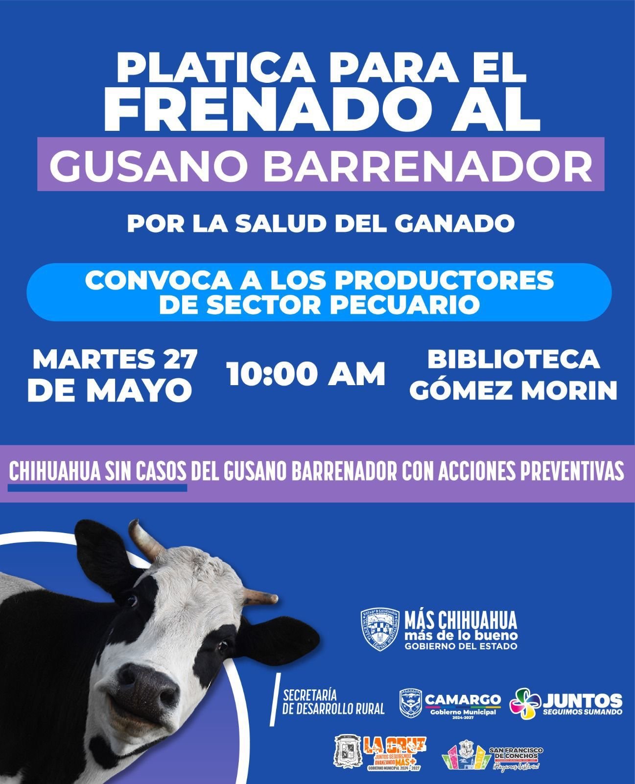La ciudadanía de La Cruz y municipios vecinos está invitada a una importante plática sobre el frenado del gusano barrenador en el estado de Chihuahua. El evento se llevará a cabo el martes 27 de mayo del presente año a las 10:00 a.m. en la biblioteca Gómez Morín de Camargo.