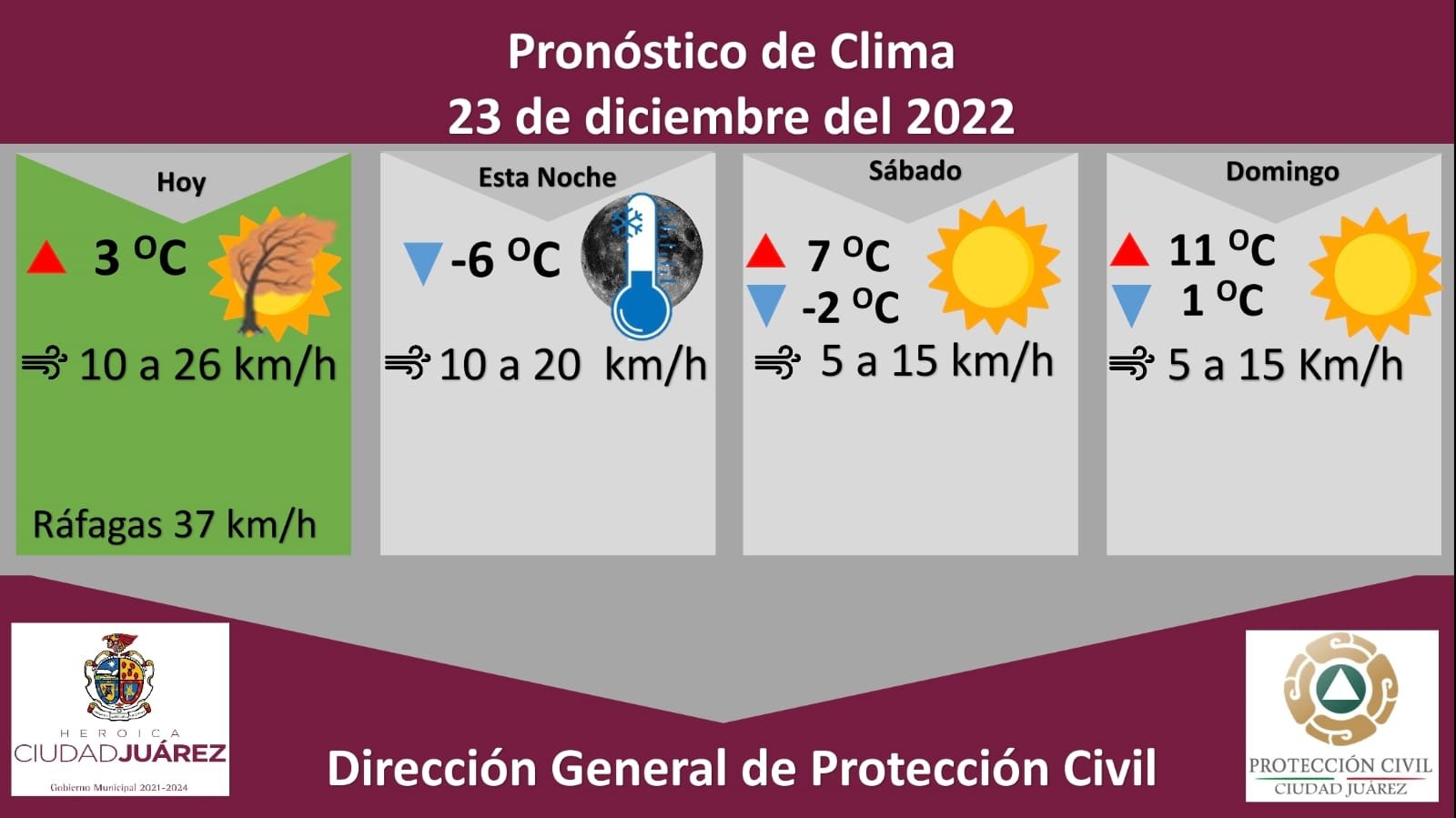 Este día la temperatura máxima será de 3°C y la mínima alcanzará -6°C, con vientos que oscilaran entre 10 a 26 kilómetros por hora, con la posibilidad de ráfagas de hasta 37 kilómetros por hora , generando sensaciones térmicas por debajo de las temperaturas contempladas.