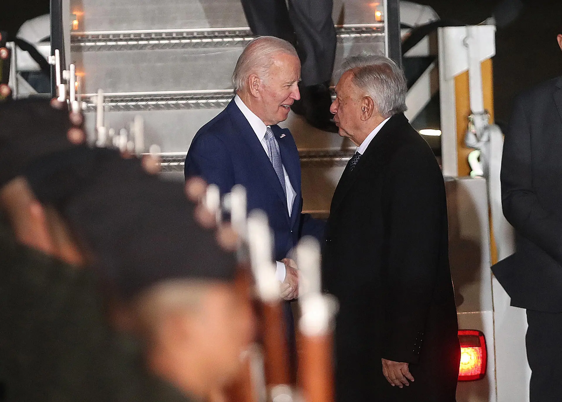 Tanto Biden y el presidente mexicano se estrecharon la mano a pie de pista, conversaron unos minutos y posteriormente abordaron juntos “La Bestia”, el vehículo blindado que traslada al presidente estadounidense, para dirigirse hacia el hotel donde se hospedará el mandatario, en el acomodado barrio de Polanco de la capital mexicana.