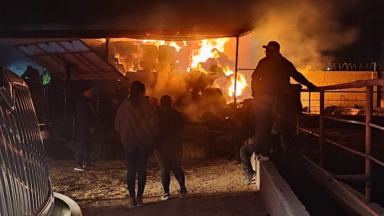 El siniestro se registró en alrededor de 4 toneladas de pacas y en un tejabán que las cubría, inició aproximadamente a las 6:40 de la tarde y los elementos de bomberos tardaron con las maniobras debido a las ráfagas de viento que se presentan en el municipio.