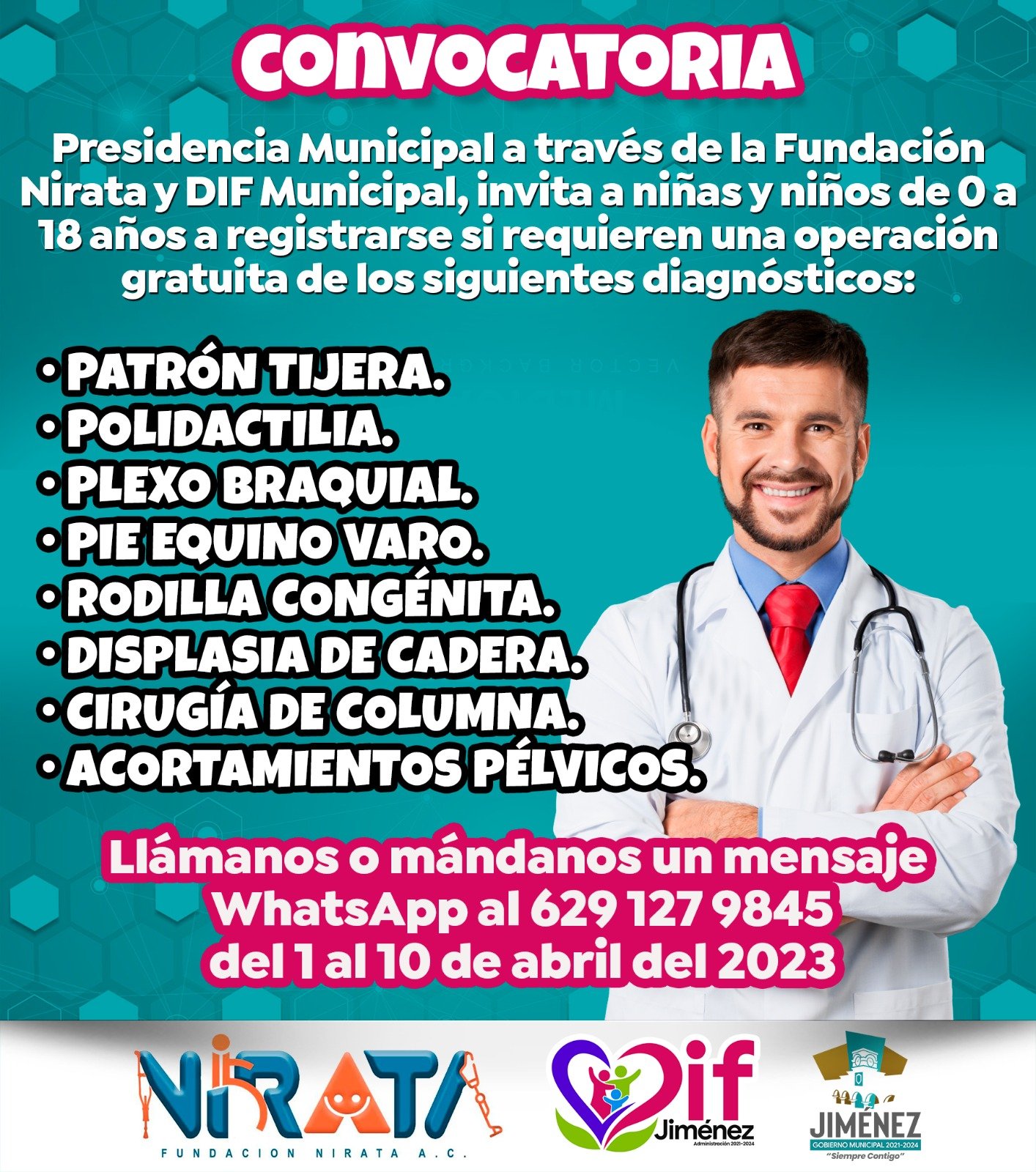 El Gobierno Municipal de Jiménez, a través de la Fundación Nirata y el DIF Municipal, invitó a niñas y niños de 0 a 18 años a registrarse si requieren una operación gratuita de los siguientes diagnósticos: