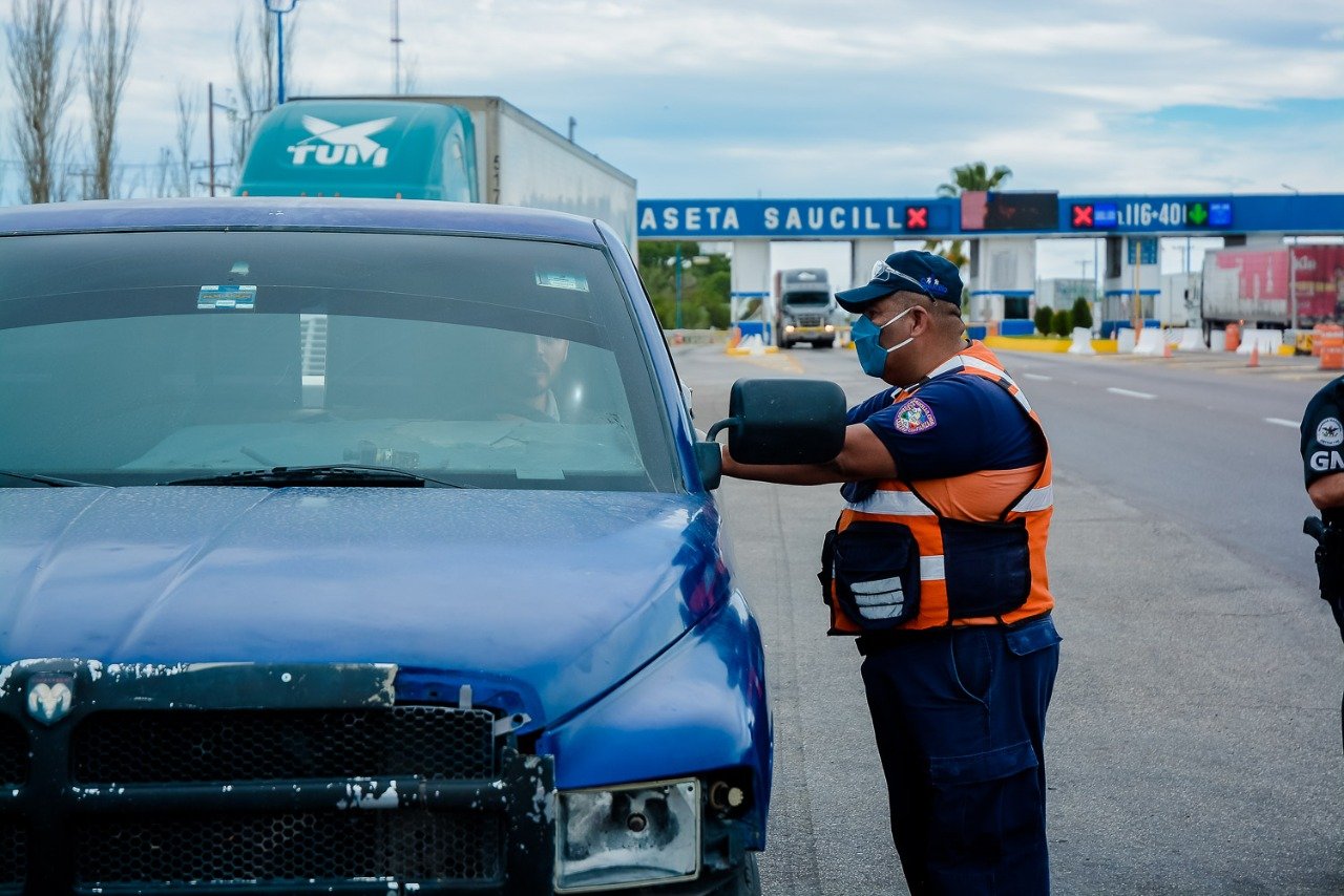 SAUCILLO.- El gobierno municipal de instaló a partir de la tarde de este miércoles un filtro sanitario en la caseta de peaje con elementos de Seguridad pública, la Guardia Nacional, Protección civil, Bomberos y Cruz Roja asi como con la Policía Federal Preventiva donde se están aplicando las medidas de prevención como la toma de temperatura con un termómetro infrarrojo.