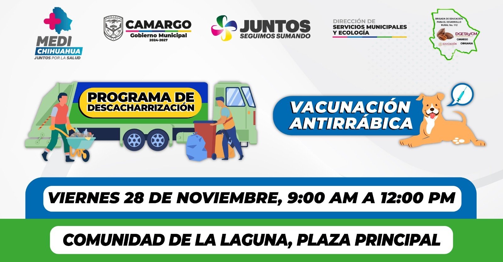 El Gobierno Municipal de Camargo, a través de la Dirección de Servicios Municipales y en coordinación con el Comité de Ecología, informa que este viernes, a partir de las 9:00 de la mañana, se realizará una jornada de descacharrización y vacunación antirrábica en la plaza principal de La Laguna.