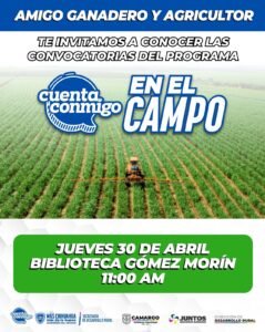 El Gobierno Municipal de Camargo, en coordinación con la Secretaría de Desarrollo Rural del Gobierno del Estado, invita a productores, ganaderos y agricultores del municipio a conocer las convocatorias del programa “Cuenta Conmigo en el Campo”, una estrategia enfocada en fortalecer el desarrollo del sector rural.