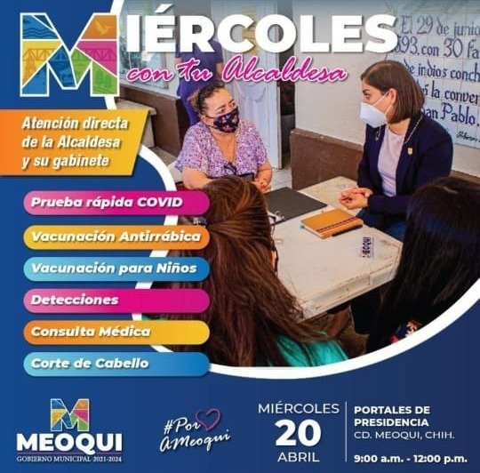 El Gobierno Municipal de Meoqui dio a conocer que el día de mañana, 20 de abril, se tendrá el día “miércoles con tu alcaldesa”, en los portales de presidencia.