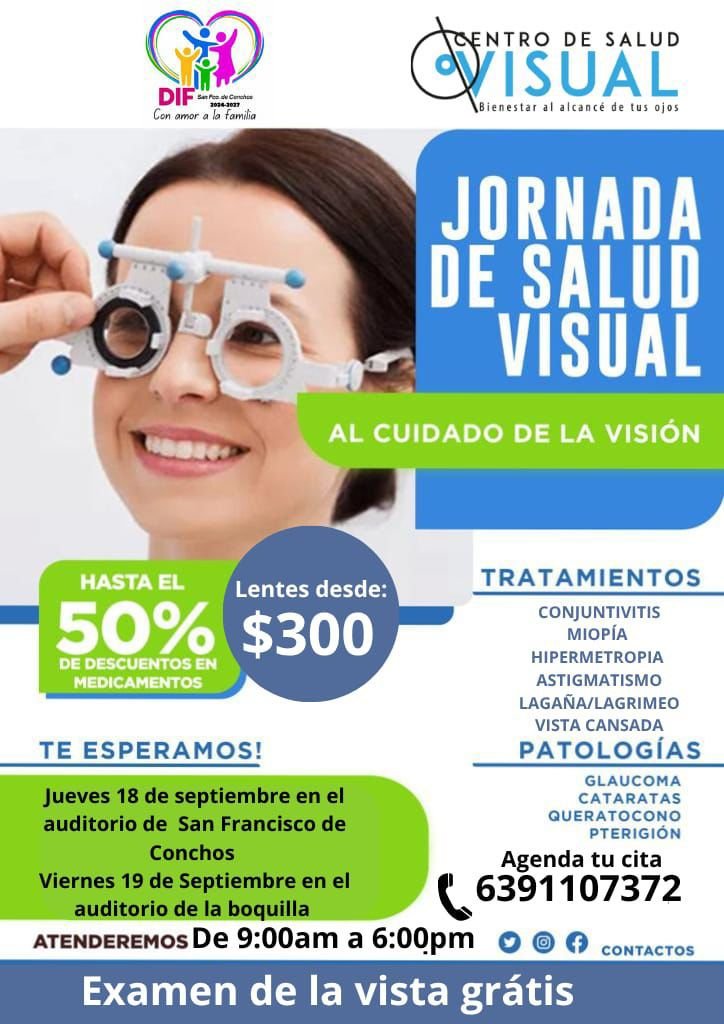 Con el objetivo de cuidar la salud visual de la ciudadanía, el Gobierno Municipal de San Francisco de Conchos, en coordinación con el DIF Municipal y el Centro de Salud Visual, llevará a cabo una Jornada de Salud Visual los próximos 18 y 19 de septiembre.