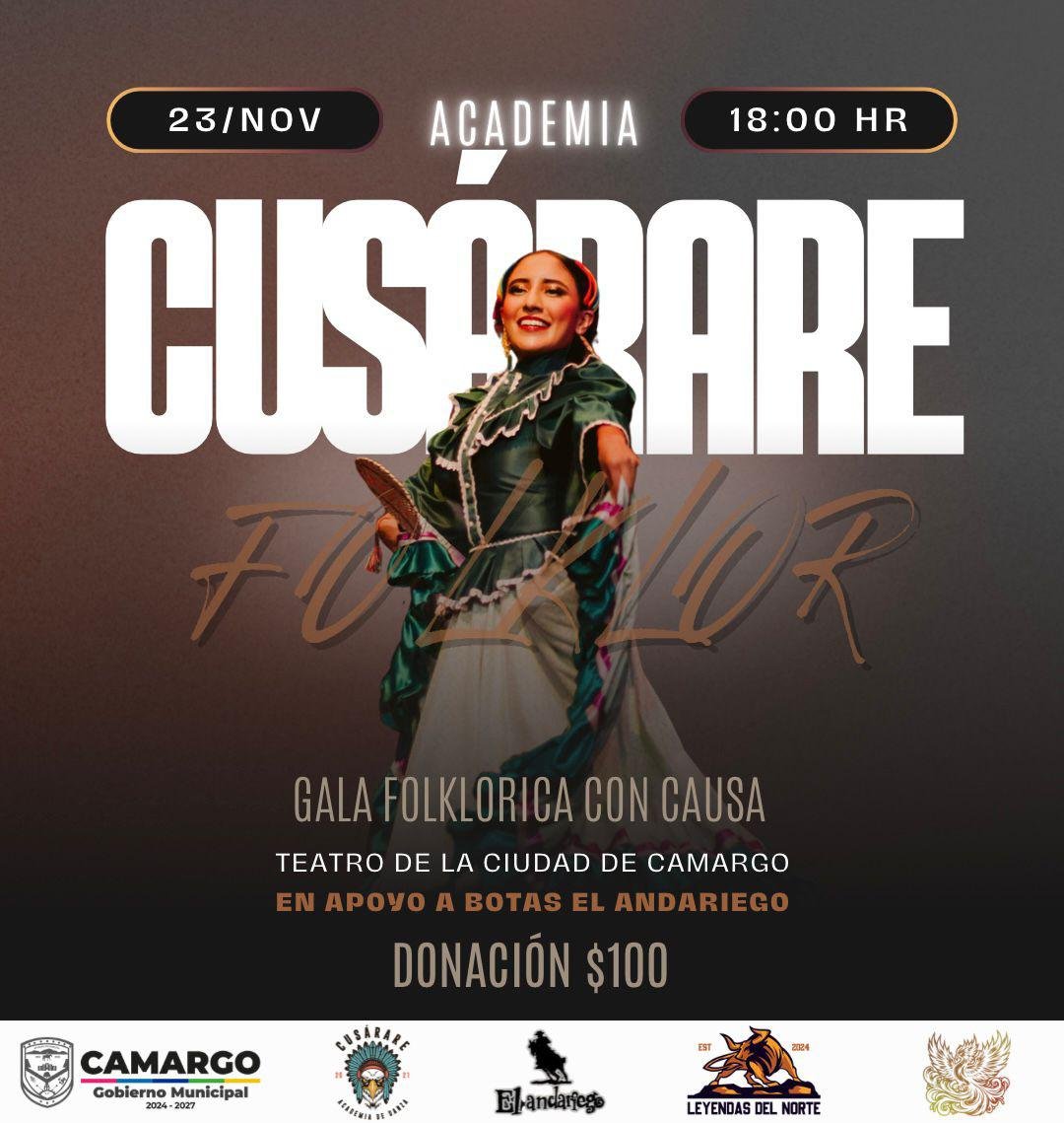 El Gobierno Municipal de Camargo invita a la presentación especial de la Academia de Danza Cusarare, este domingo 23 de noviembre en el Teatro de la Ciudad de Camargo, Chihuahua.