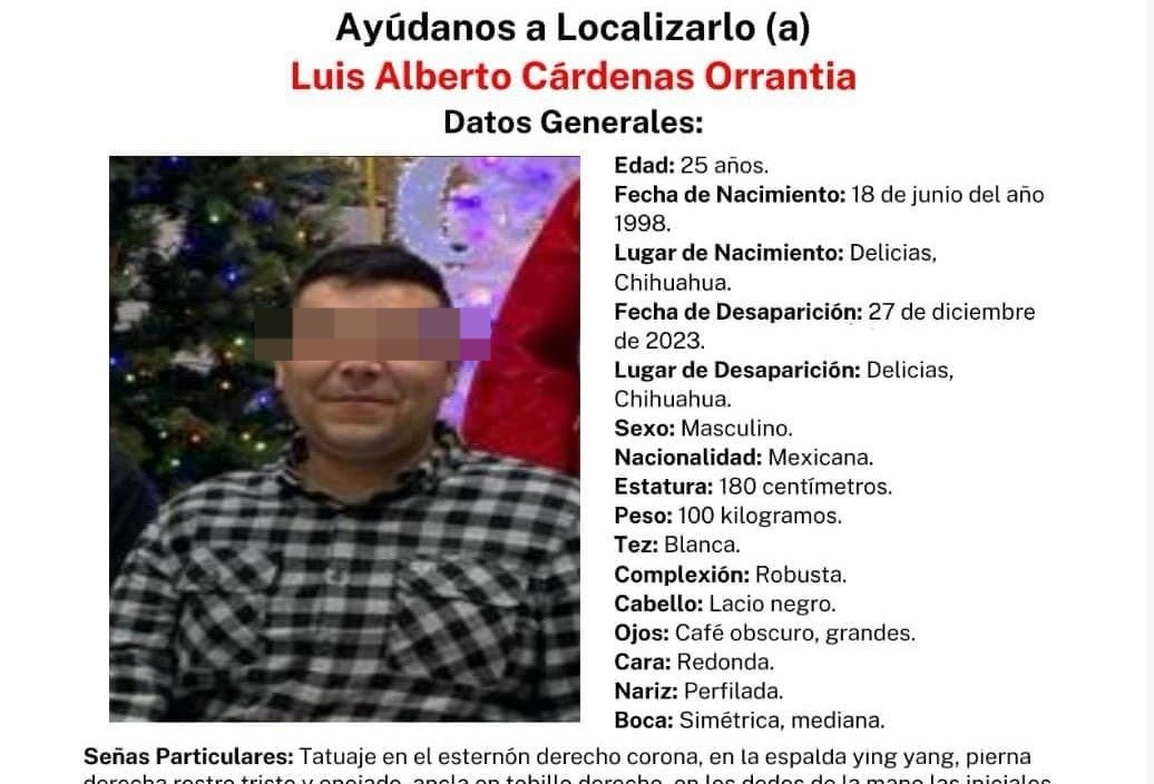 Se dio a conocer que fue encontrado sin vida el joven Luis Alberto C.O., de 25 años de edad, mismo que contaba con reporte de desaparición desde el pasado 27 de diciembre en Delicias.