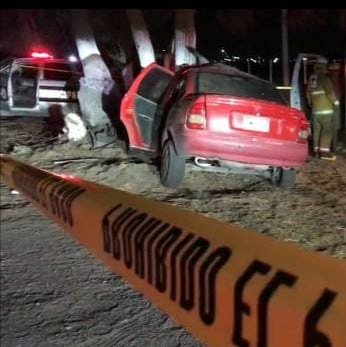 Los paramédicos y agentes al llegar tuvieron a la vista un automóvil de la marca Chevrolet, línea Chevy, color rojo, modelo 2001 con placas de circulación ELW-24-11 del estado de Chihuahua, el cual quedó incrustado en un árbol en el carril de sur a norte.