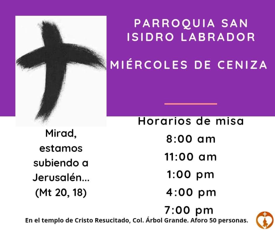 Los horarios de las misas en la Parroquia de San Isidro Labrador serán 8 y 11 de la mañana, 1, 4 y 7 de la tarde.