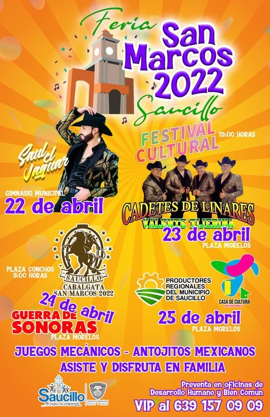 El día domingo 24 de abril es la Cabalgata San Marcos 2022, en la plaza Conchos a las 8 de la mañana, así como el evento Guerra de Sonoras, en la plaza Morelos.