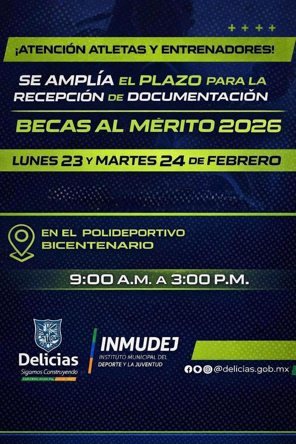 El Instituto Municipal del Deporte y la Juventud (INMUDEJ) informó que hoy martes 24 de febrero es el último día para la recepción de documentación del programa Becas al Mérito 2026,m.