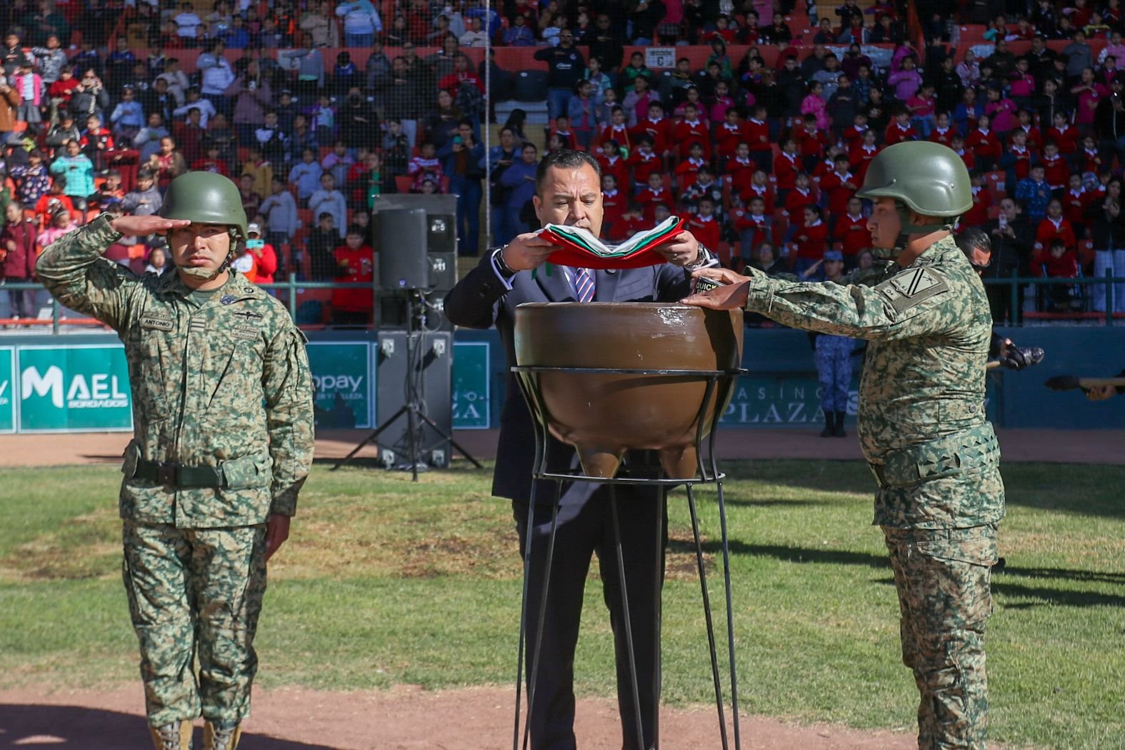 Con la participación de 2 mil 500 estudiantes de tercer grado, pertenecientes a 72 planteles educativos, la totalidad de este nivel en el municipio, el Gobierno Municipal de Delicias conmemoró el Día de la Bandera con un acto cívico celebrado en el Gran Estadio Delicias, en una jornada que fortaleció los valores cívicos y el amor por los símbolos patrios entre la niñez.
