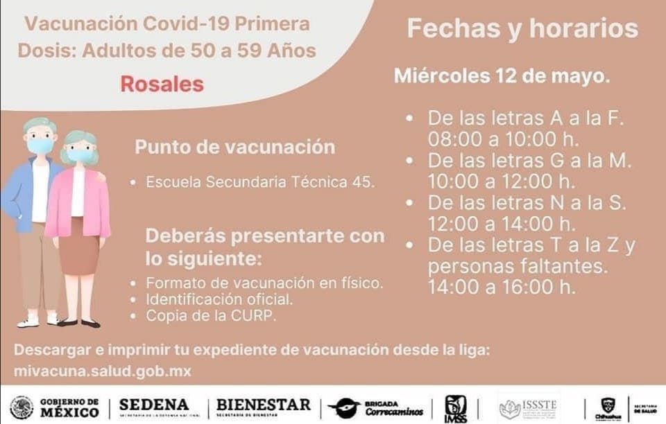 Hoy inicio la primera aplicación de la vacuna contra la Covid-19 a los adultos de 50 a 59 años de edad en el municipio de Rosales.
